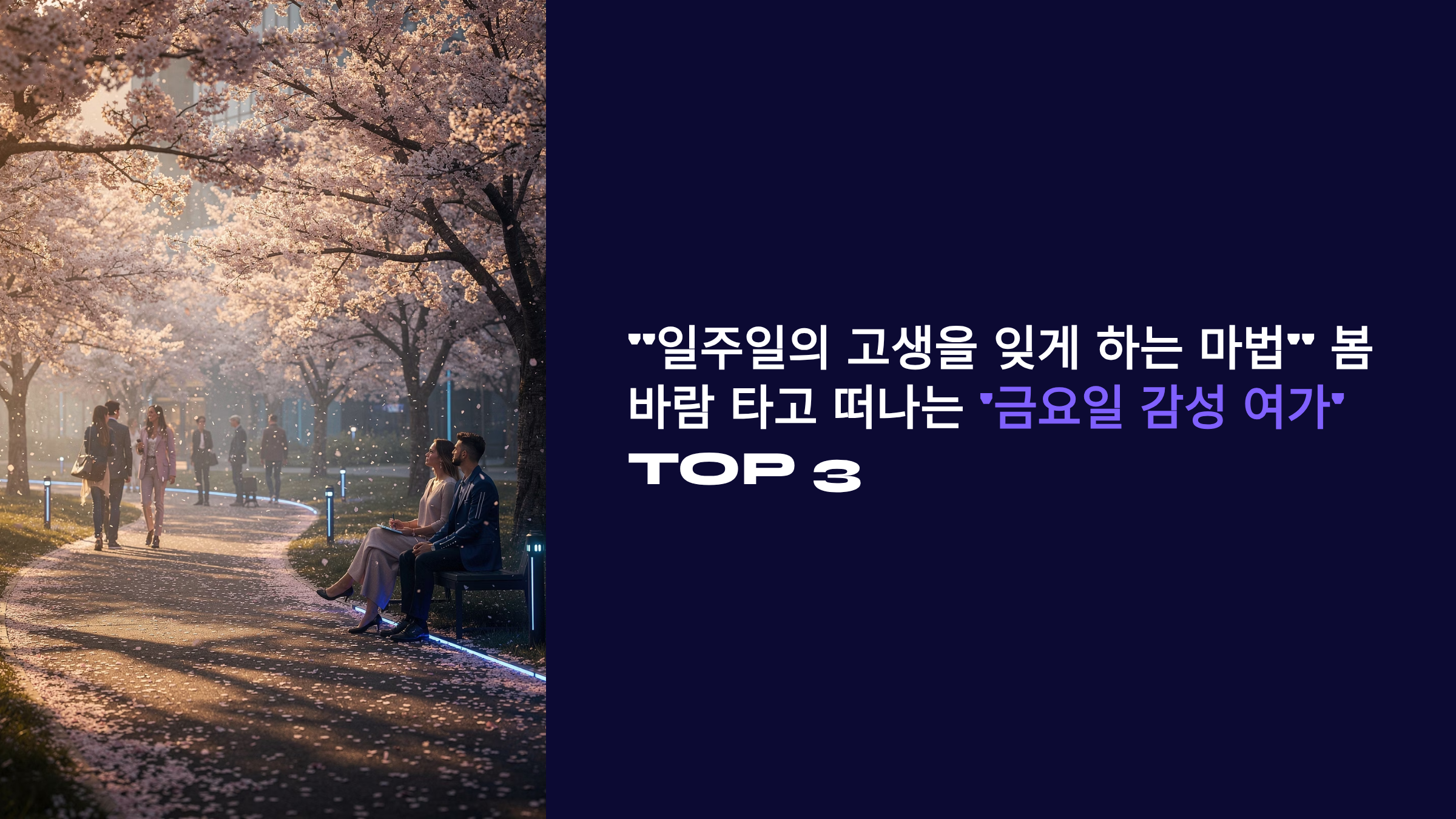 "일주일의 고생을 잊게 하는 마법" 봄바람 타고 떠나는 '금요일 감성 여가' TOP 3🎈 즐거운 여가 2026. 3. 27. 10:25반응형