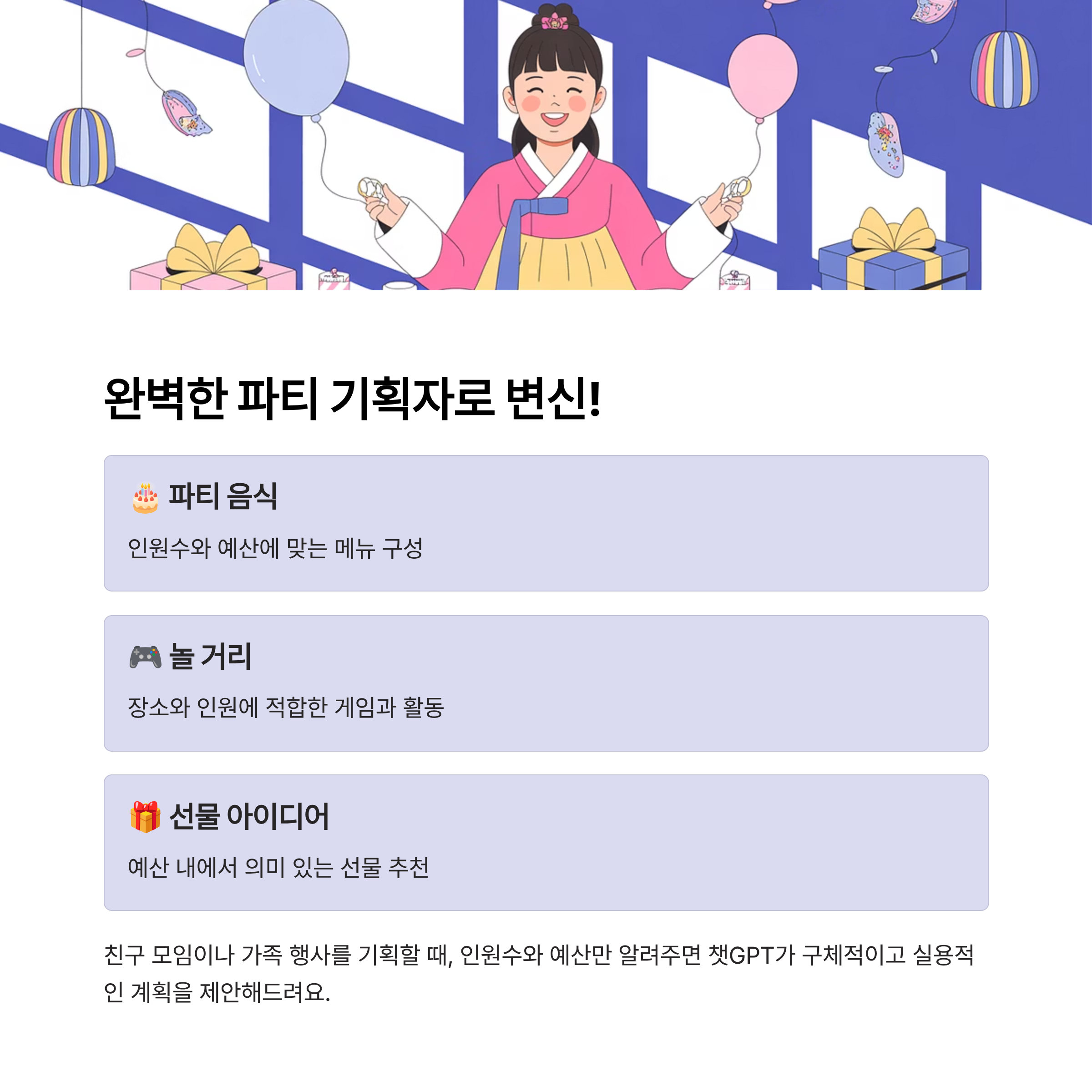 '오늘 저녁은 뭐 먹지?', '친한 친구 생일 파티는 어떻게 준비하지?', '새로 산 전자기기 설명서가 너무 어려워…'. 매일 마주하는 소소한 고민부터 복잡한 문제까지, 일상은 크고 작은 결정의 연속입니다. 매번 검색하거나 지인에게 물어보는 것도 번거롭죠. 하지만 이제 걱정 마세요! 챗GPT를 활용하면 이 모든 고민을 쉽고 빠르게 해결할 수 있습니다.