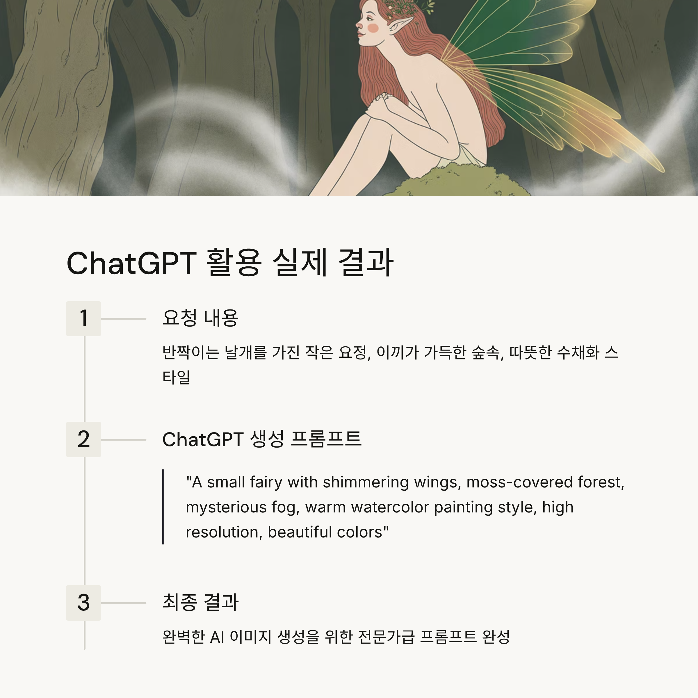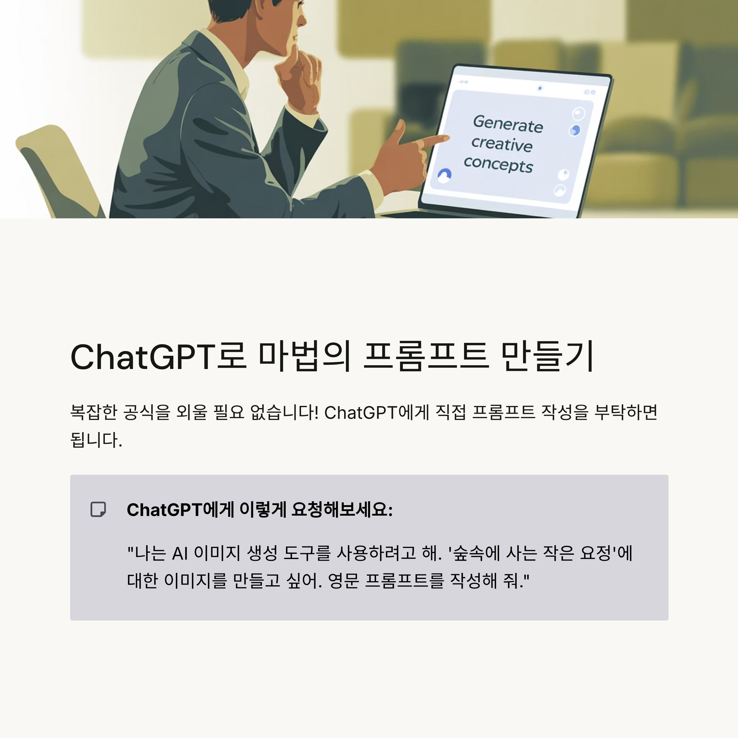 하지만 이제 걱정 마세요! 챗GPT와 몇 가지 AI 도구만 있다면, 누구나 1분 만에 머릿속 상상을 현실로 만들어낼 수 있습니다. 이 글을 끝까지 읽으시면, 여 러분은 AI에게 말을 걸어 멋진 이미지를 생성하는 '마법의 언어'를 배우게 될 것입니다.
