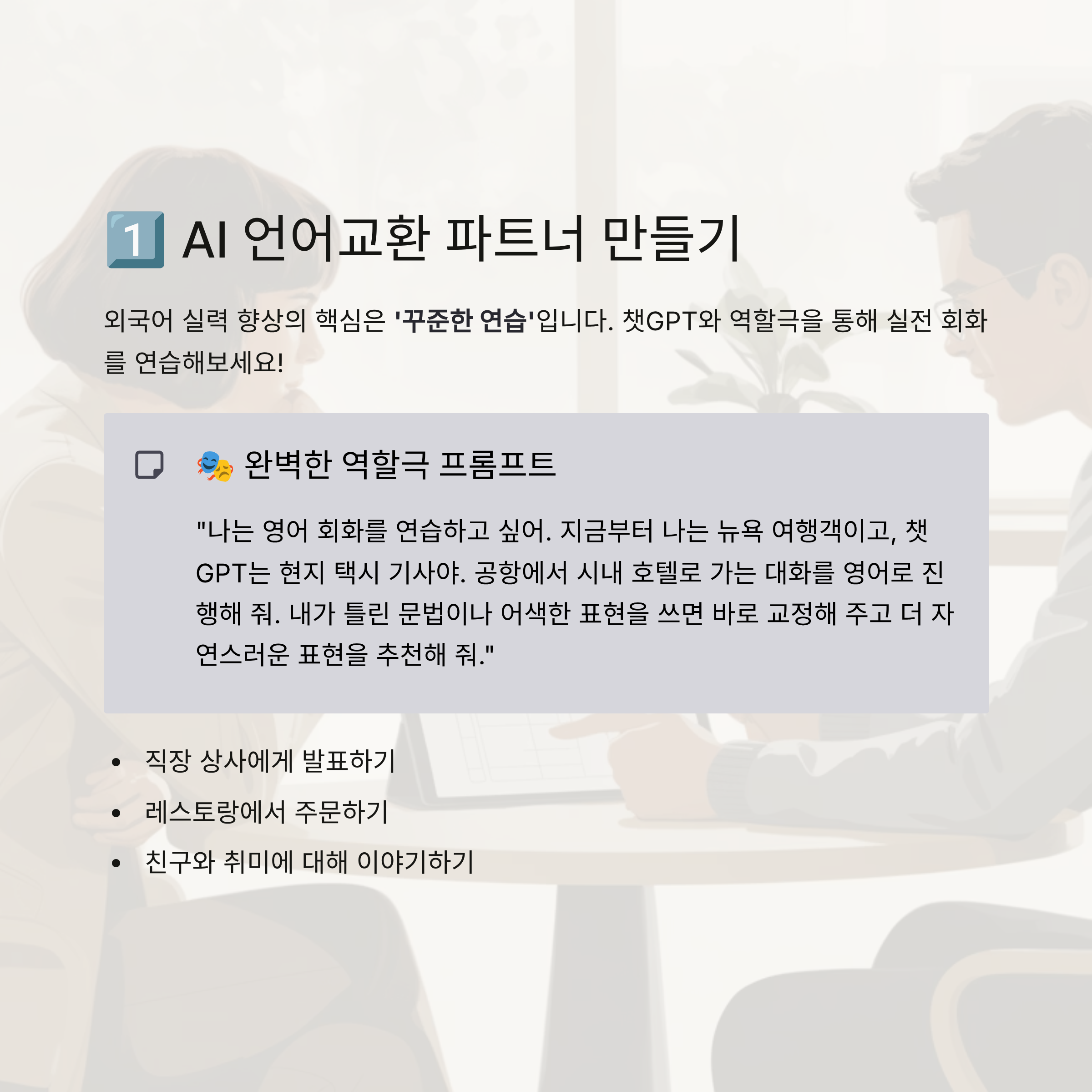챗GPT & AI도구 #13. 외국어 공부, 챗GPT로 끝내자! AI와 함께하는 초고효율 언어 학습법챗GPT & AI 도구 2025. 9. 23. 11:08반응형반응형