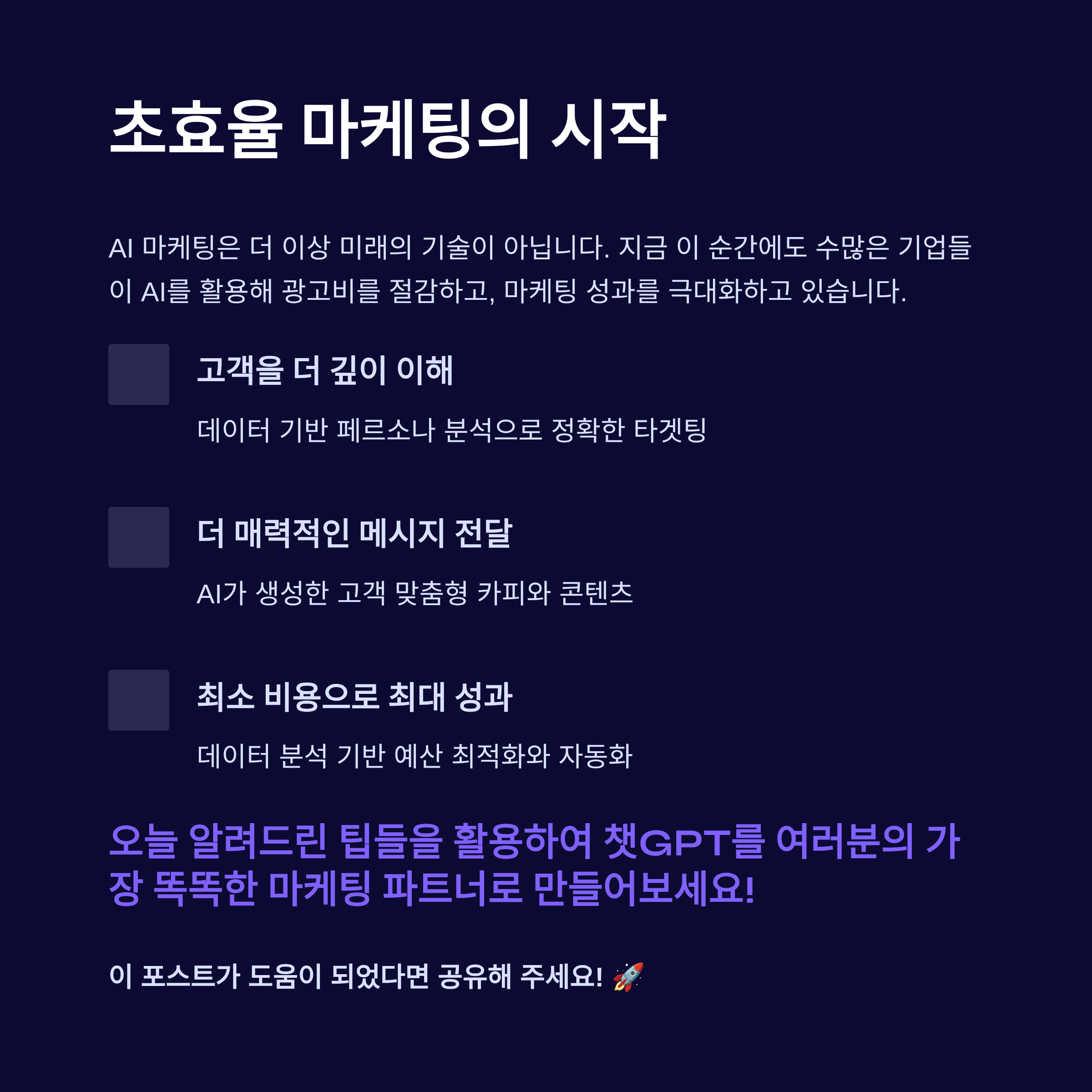 이번 포스팅에서는 챗GPT를 활용해 광고비를 낭비하지 않고 마케팅 성과를 2배 이상 끌어올리는 초효율 전략을 알려드릴게요. 이 글을 끝까지 읽으시면, 여러분은 AI를 활용해 똑똑하게 마케팅하는 방법을 알게 될 것입니다.