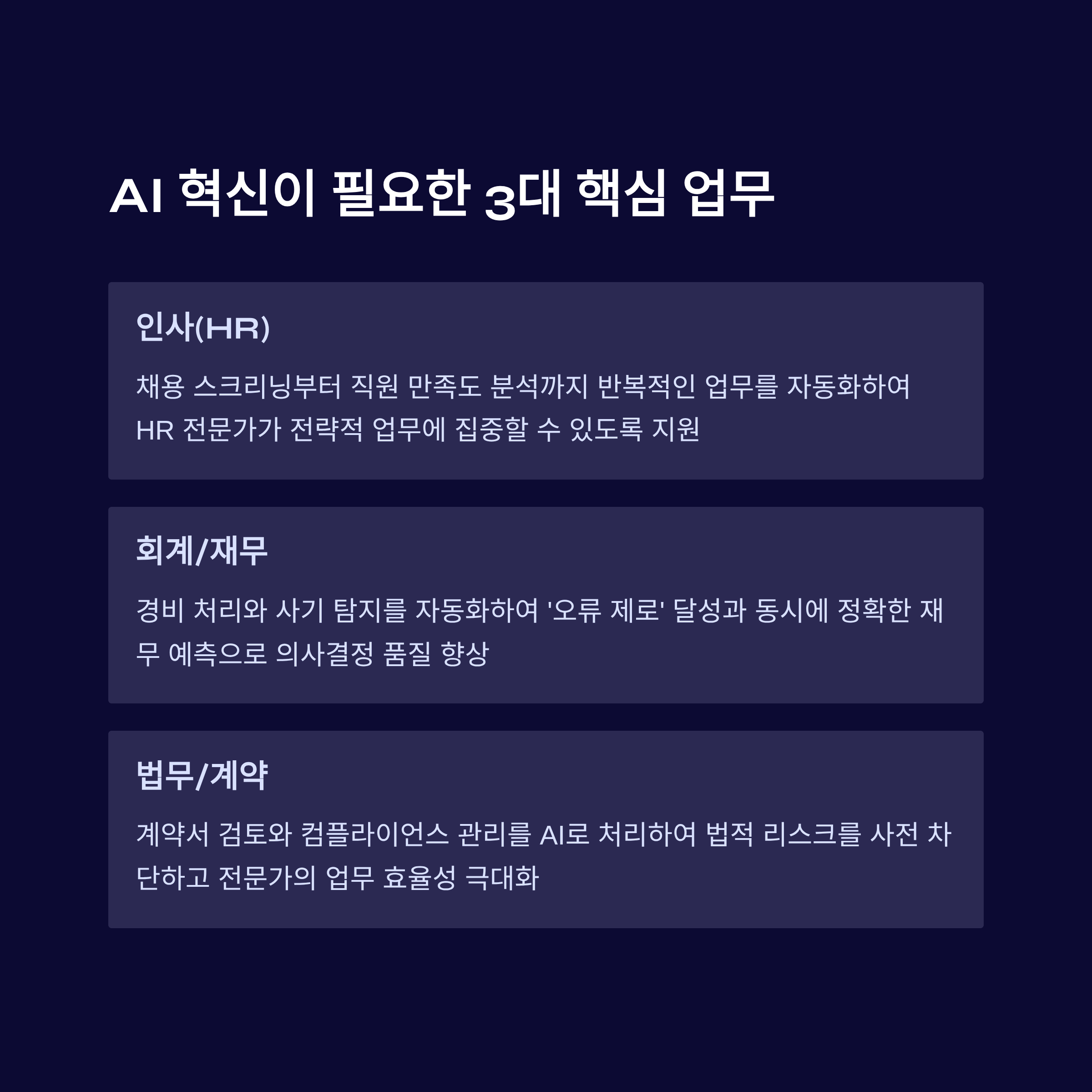 지금까지 우리는 금융, 마케팅, 유통 등 기업의 '수익 창출 최전선'에 AI를 어떻게 적용하는지 알아보았습니다. 하지만 기업의 진정한 혁신은 눈에 잘 띄지 않는 '백 오피스(Back Office)' 부문, 즉 회계, 인사(HR), 법무와 같은 관리 부서에서 완성됩니다. 이 부서들은 업무가 반복적이고, 오류 발생 시 기업에 치명적인 리스크를 안겨줄 수 있다는 특징이 있습니다.