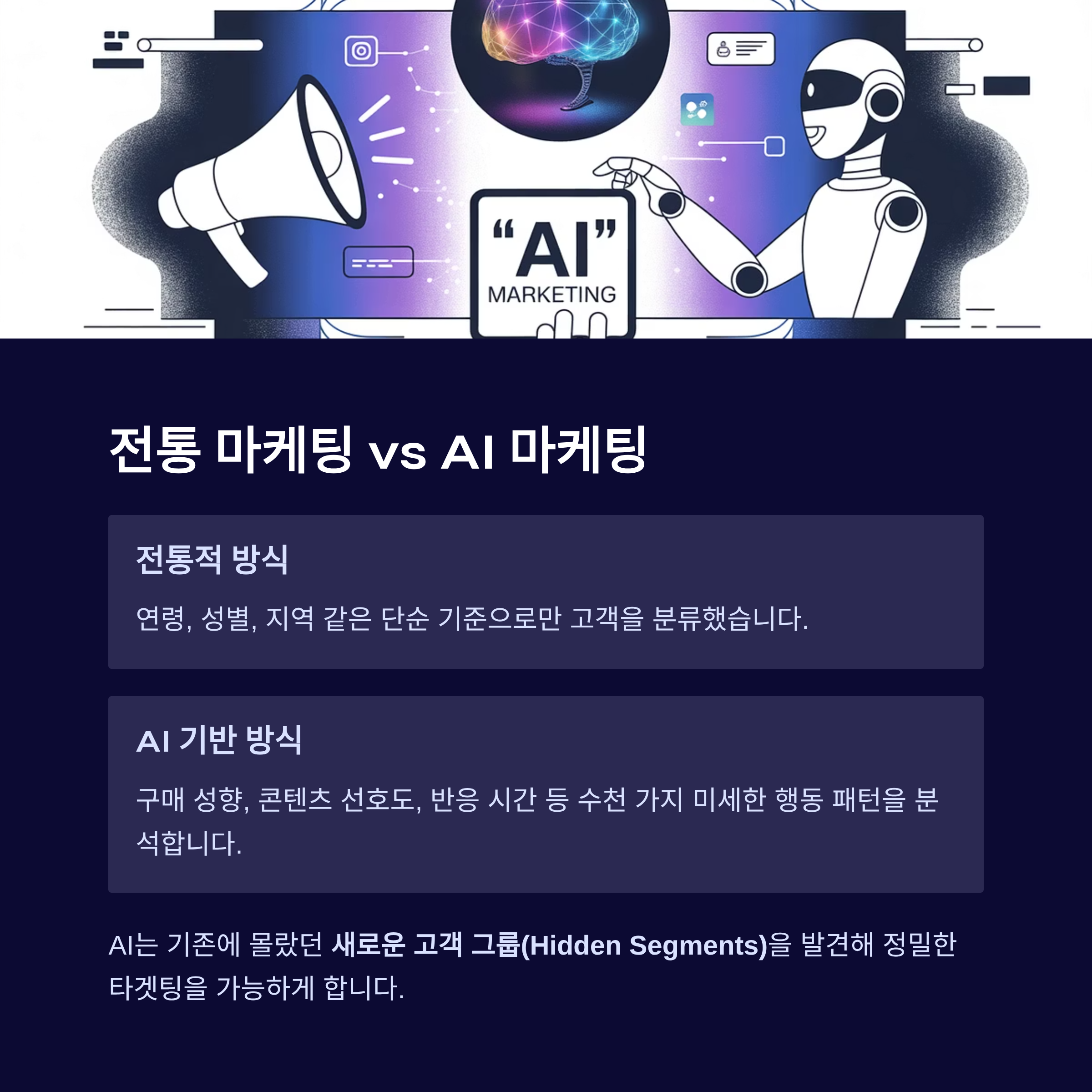 이러한 초개인화(Hyper-personalization) 시대에, AI는 마케터의 필수 무기가 되었습니다. AI는 고객의 과거 구매 기록, 웹사이트 방문 패턴, 심지어 마우스 커서의 움직임까지 분석하여, 고객이 무엇을 원할지 '미리' 예측합니다. 단순한 분류를 넘어, 고객 개개인에게 최적화된 마케팅 메시지, 채널, 타이밍을 찾아주는 것입니다.
