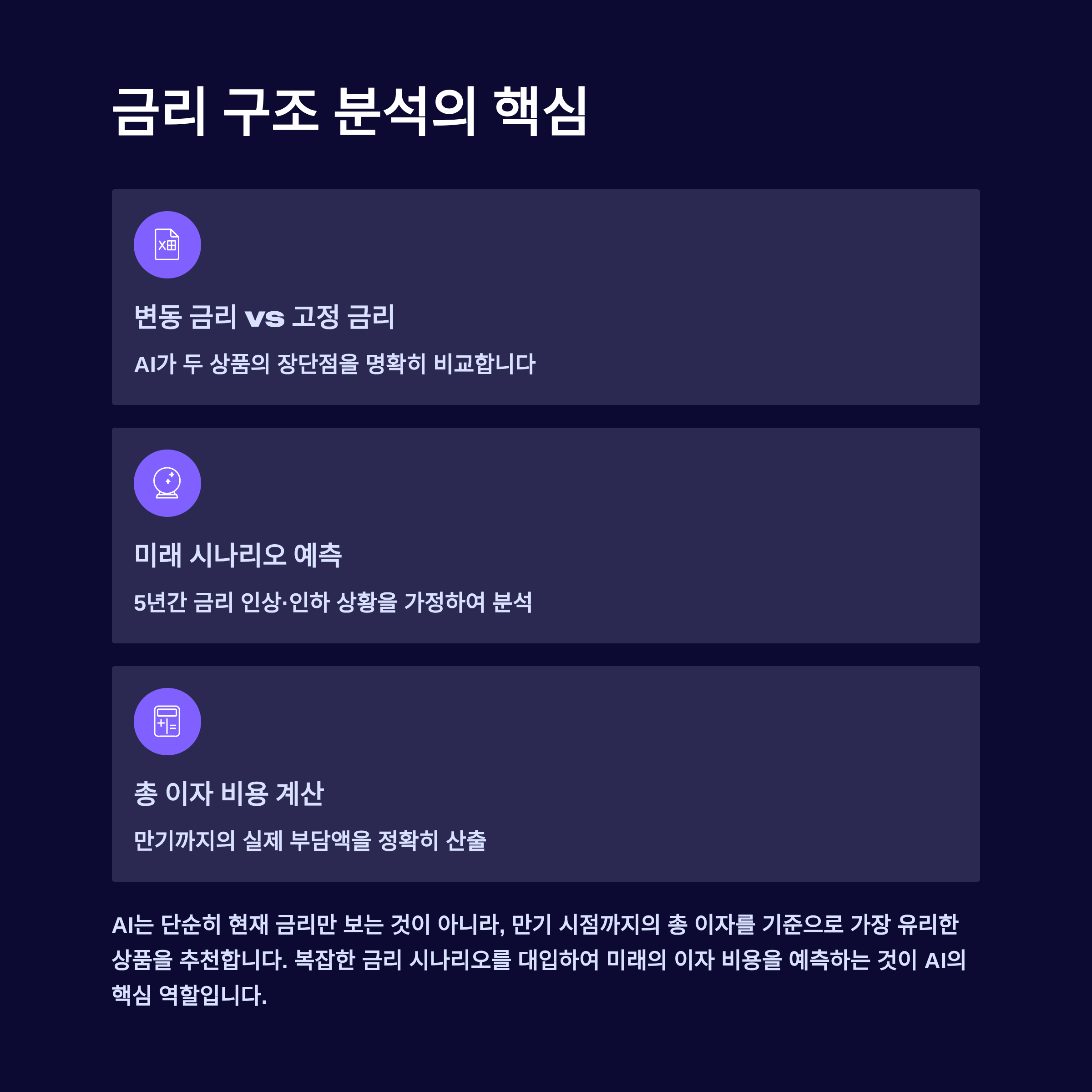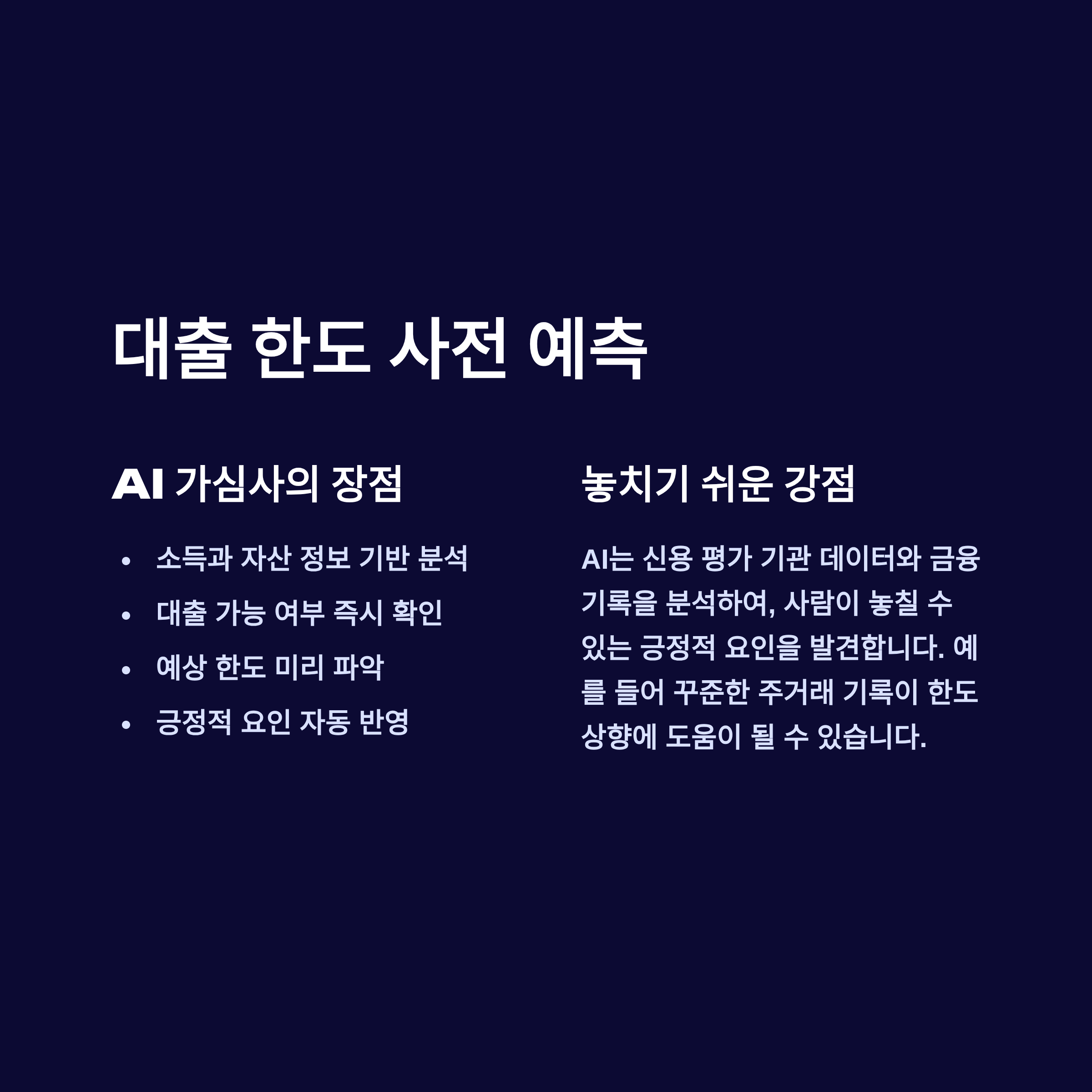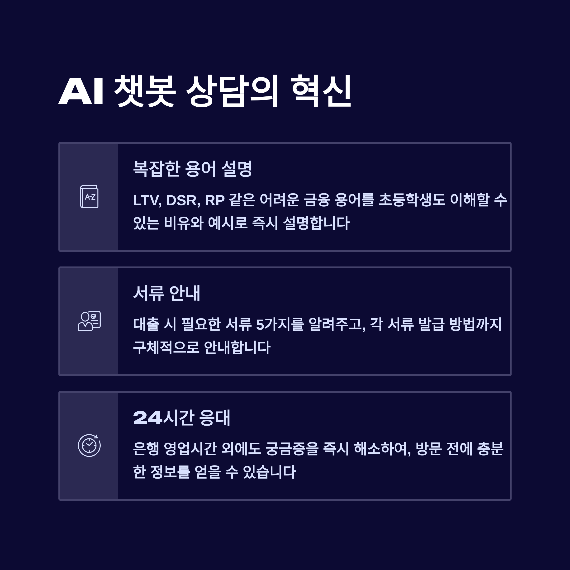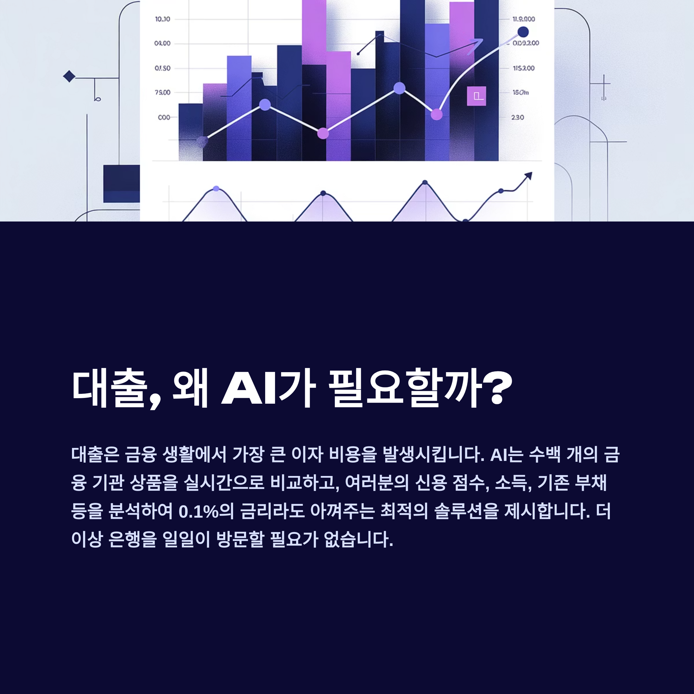 이제 AI 뱅커와 챗봇이 이 모든 금융 고민을 해결해 줍니다. AI는 단순히 상품 정보를 제공하는 것을 넘어, 여러분의 현재 재무 상태, 미래 목표, 신용도까지 종합적으로 분석하여, 세상의 모든 금융 상품 중에서 '나에게 100% 최적화된' 상품을 찾아주는 완벽한 **'개인 맞춤형 금융 컨설턴트'**가 되어줍니다.