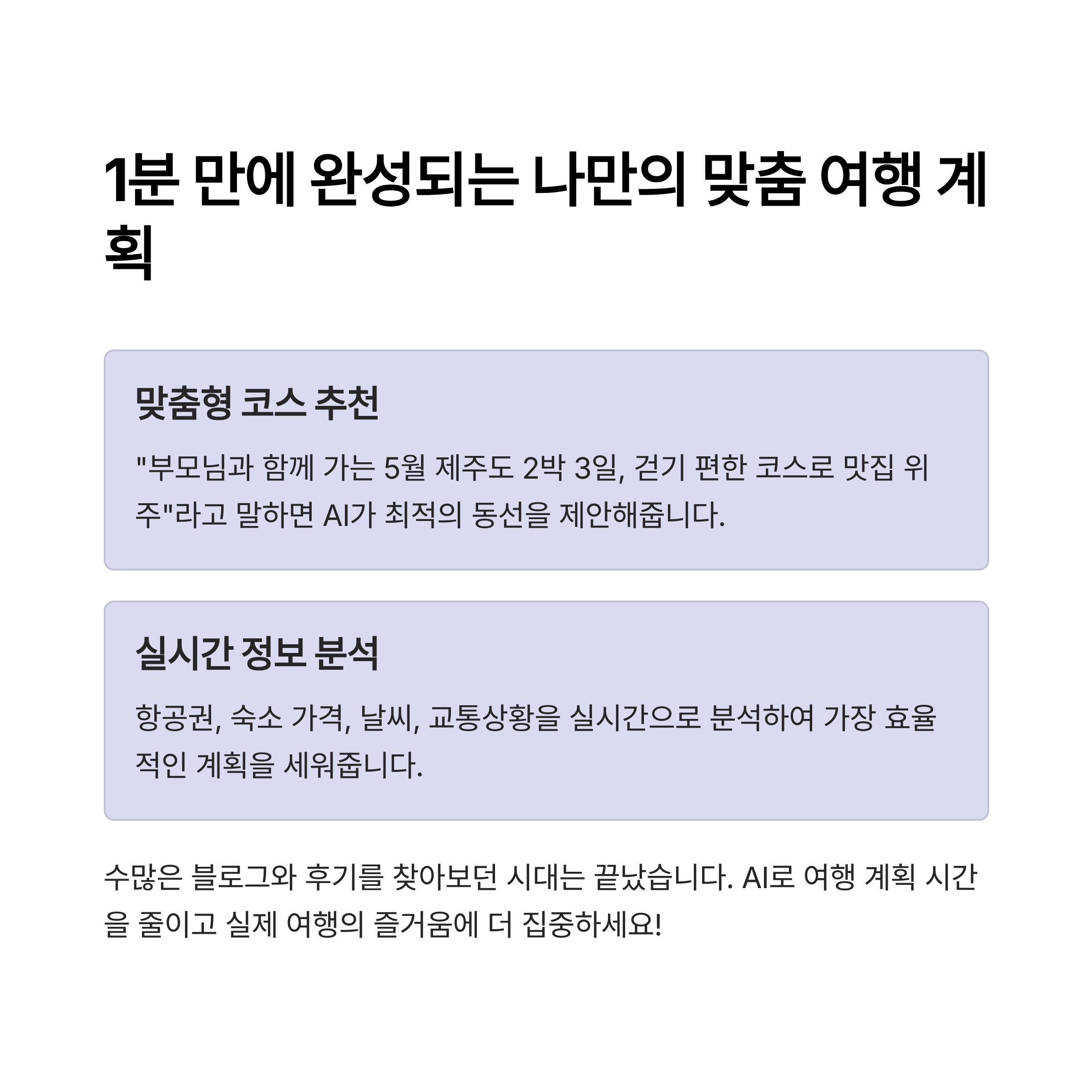 "어디로 여행을 떠나볼까?" 여행의 설렘과 함께 시작되는 고민, 혹시 여행 계획을 세우는 것이 어렵게 느껴진 적 없으신가요? 이제는 걱정 마세요. 인공지능(AI)이 여러분의 똑똑한 여행 가이드가 되어, 계획부터 경험까지 모든 과정을 더 쉽고 즐겁게 만들어 줄 것입니다.