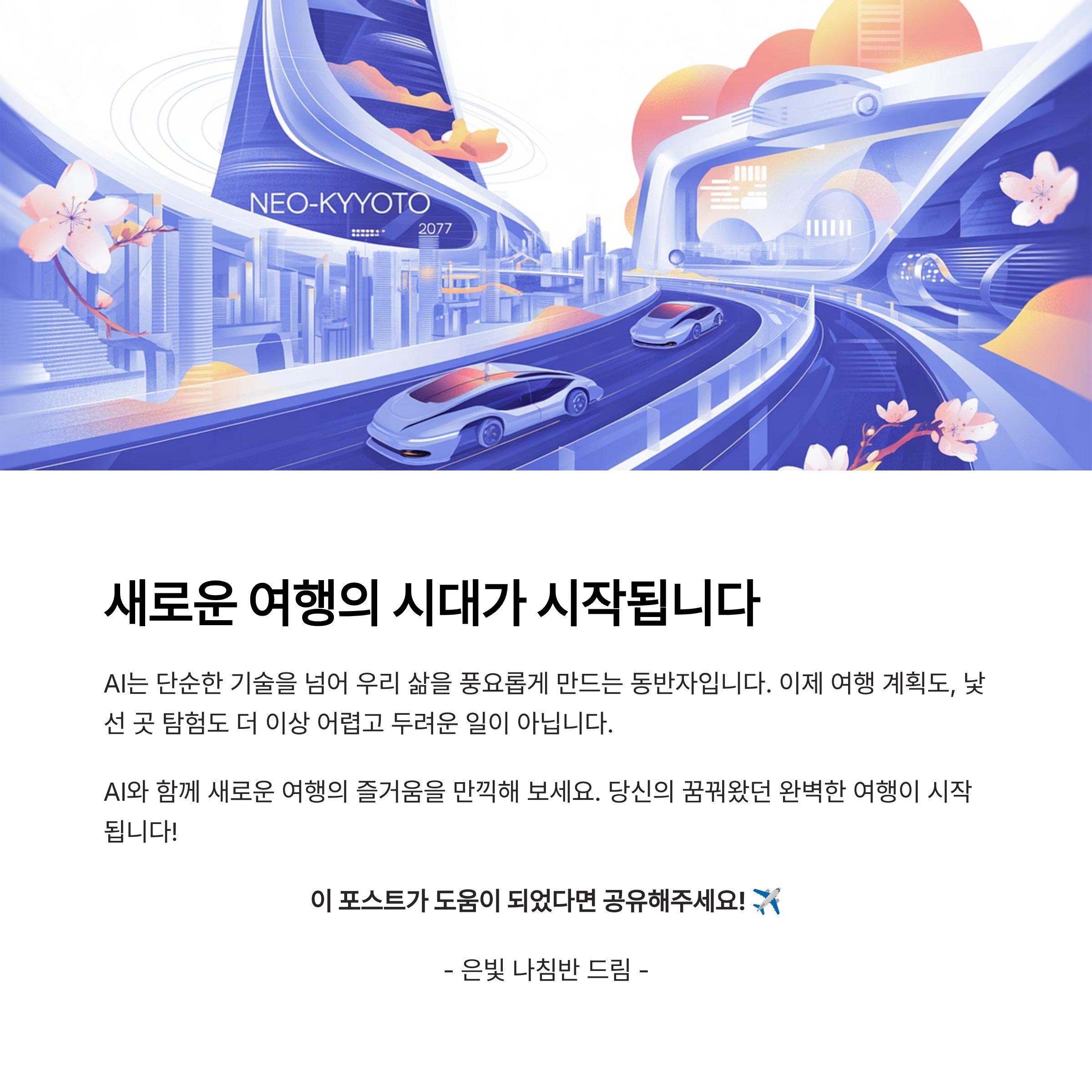"어디로 여행을 떠나볼까?" 여행의 설렘과 함께 시작되는 고민, 혹시 여행 계획을 세우는 것이 어렵게 느껴진 적 없으신가요? 이제는 걱정 마세요. 인공지능(AI)이 여러분의 똑똑한 여행 가이드가 되어, 계획부터 경험까지 모든 과정을 더 쉽고 즐겁게 만들어 줄 것입니다.