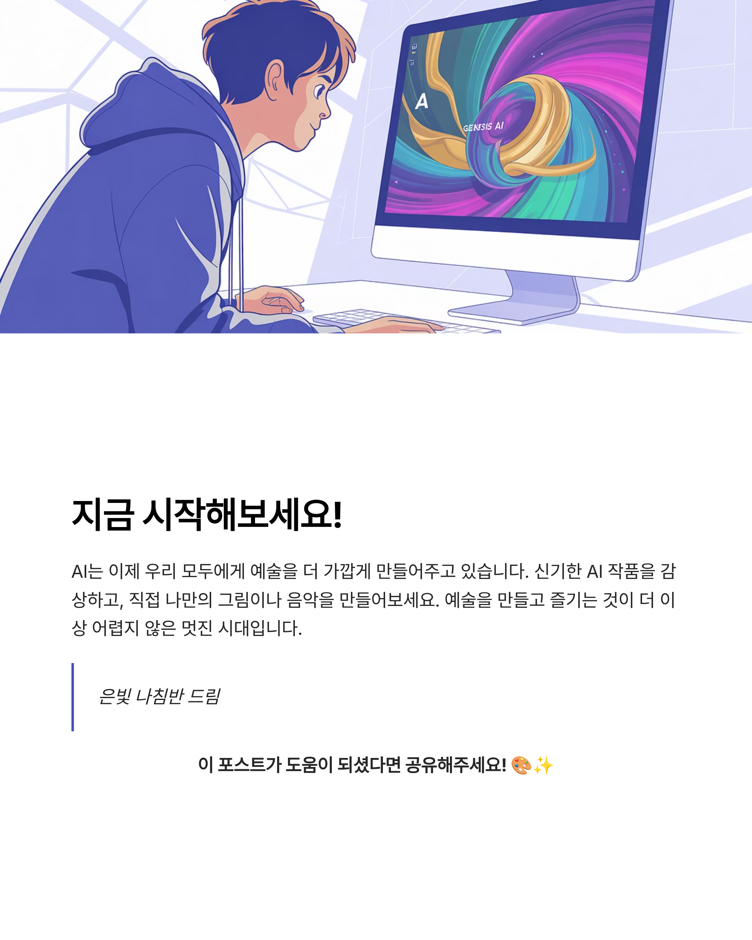 혹시 "AI가 예술도 만들 수 있을까?"라고 생각해 본 적 있으신가요? 예술은 인간 고유의 영역이라고 여겨졌지만, 이제는 인공지능이 인간과 함께 창작의 영역을 넓혀가고 있습니다. AI는 더 이상 차가운 기계가 아니라, 우리의 창의성을 자극하고 새로운 아름다움을 만들어내는 예술가가 되어가고 있습니다.
